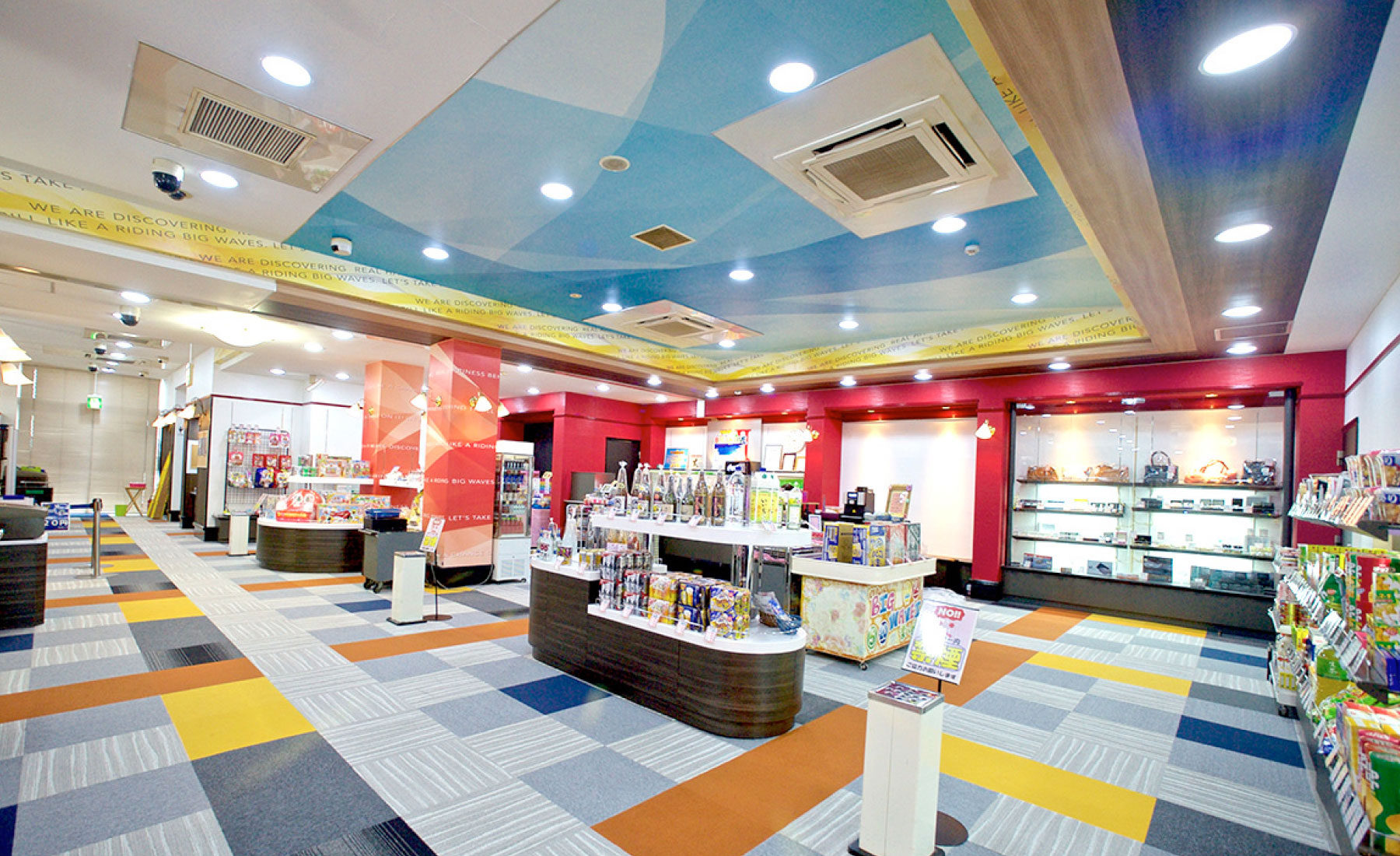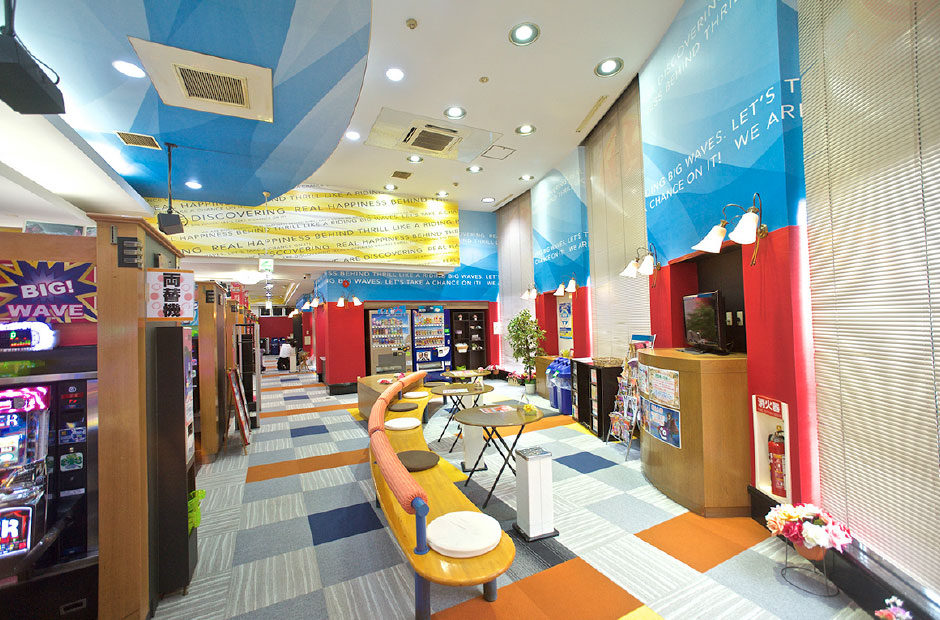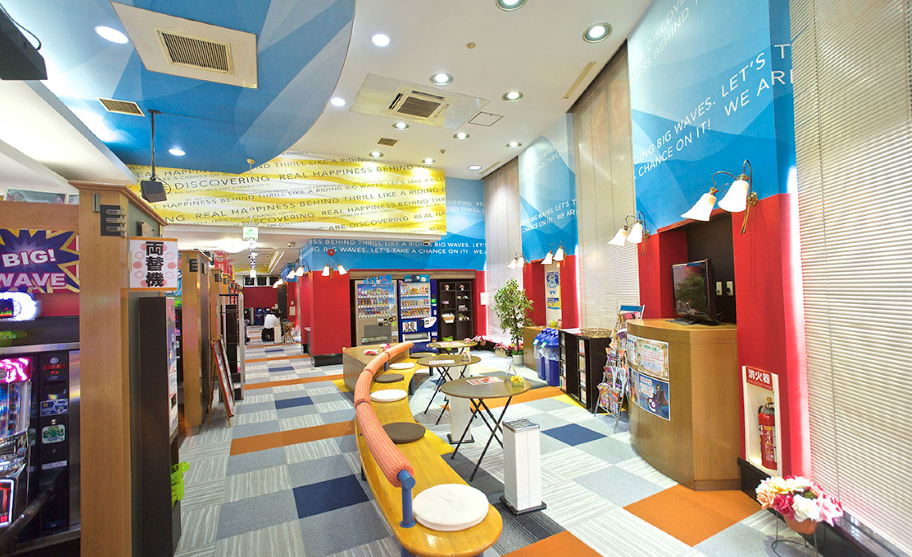 経年劣化と暗い照明でせっかくの景品がくすむカウンター周り。コストアップに繋がりやすい照明に手をつけることなく、素材を吟味して明るくポップなイメージに変更しました。