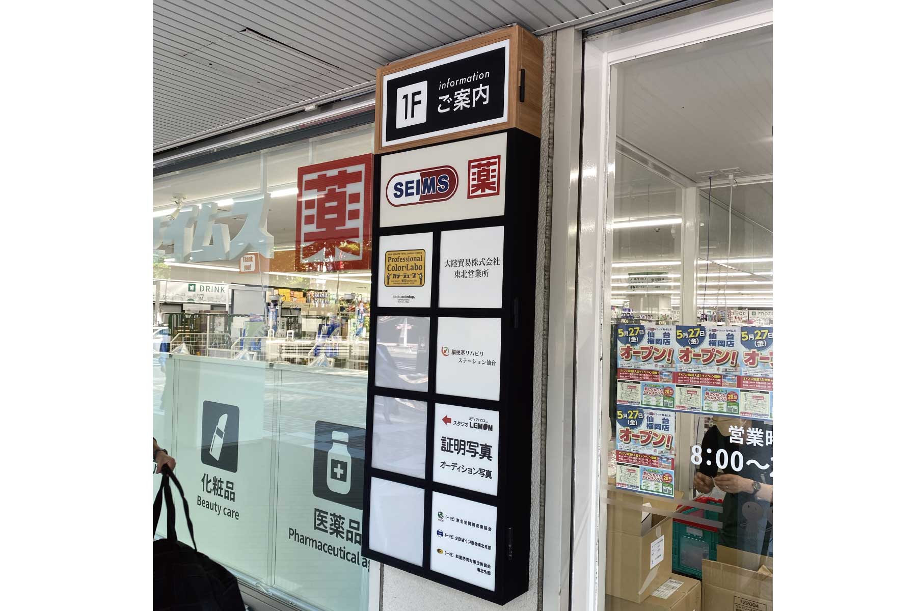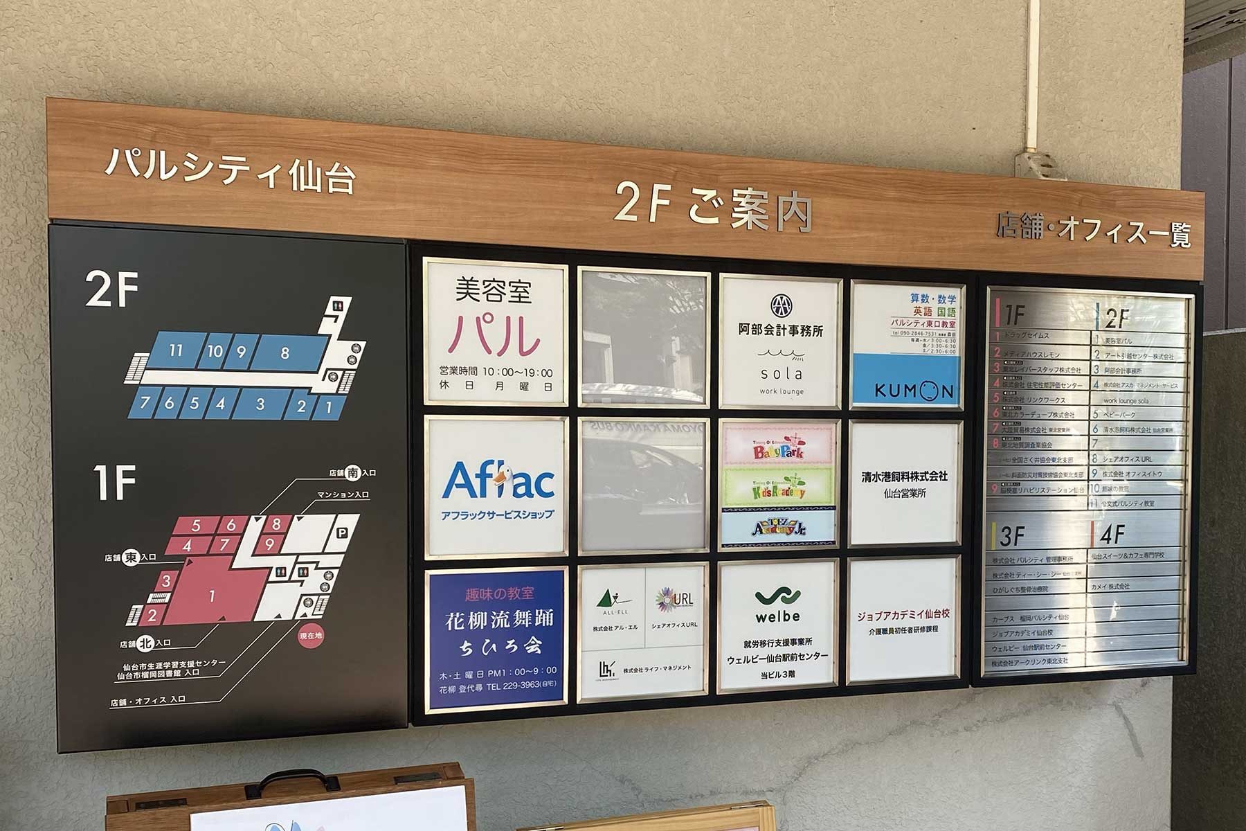 集合看板ではフロアマップのデザインもとても重要です。グラフィックデザインは年々大きく進化していて、リニューアルの出来を大きく左右します。このビルはお年寄りから子供まで幅広い年齢層に利用されています。当社では利用者に寄り添う分かりやすいスマートなデザインを心がけています。