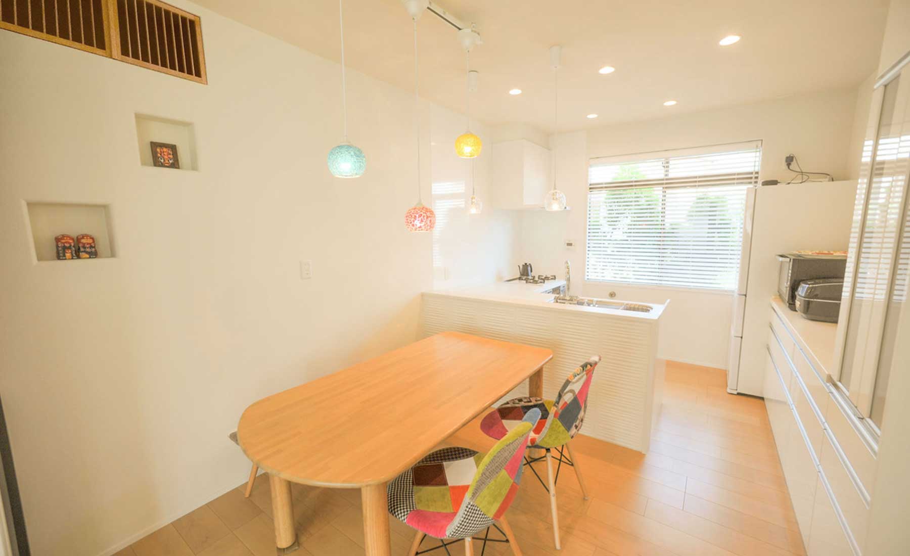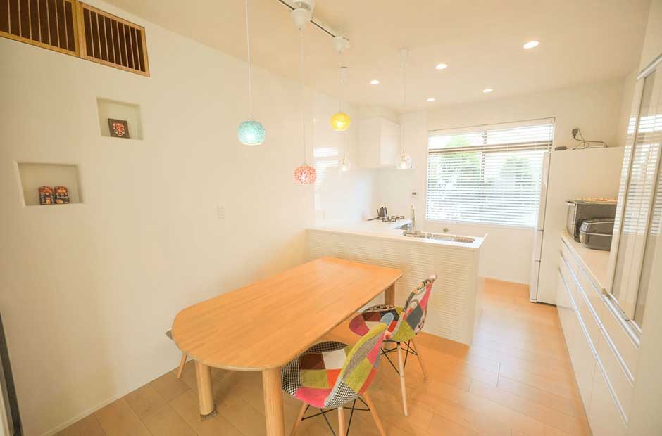 私たちは特別家相に詳しいわけではありません。だけど絶対NGとされている事は避けけるべきと思います。長い歴史から導き出された家づくりのルールが家相なのだから、ありがたく参考にさせていただくべきだと考えます。この家は家相もよく考えられていて、施主の希望を叶えつつ家相にも悪影響を与えないように設計するのは針に糸を通すような緻密さが求められた。たくさんの制限をクリアしてできたキッチンはついついたくさん料理したくなるキッチンになったようだ。また鬼門には白い波型の家具を配置して悪いものを流す工夫を施しました。