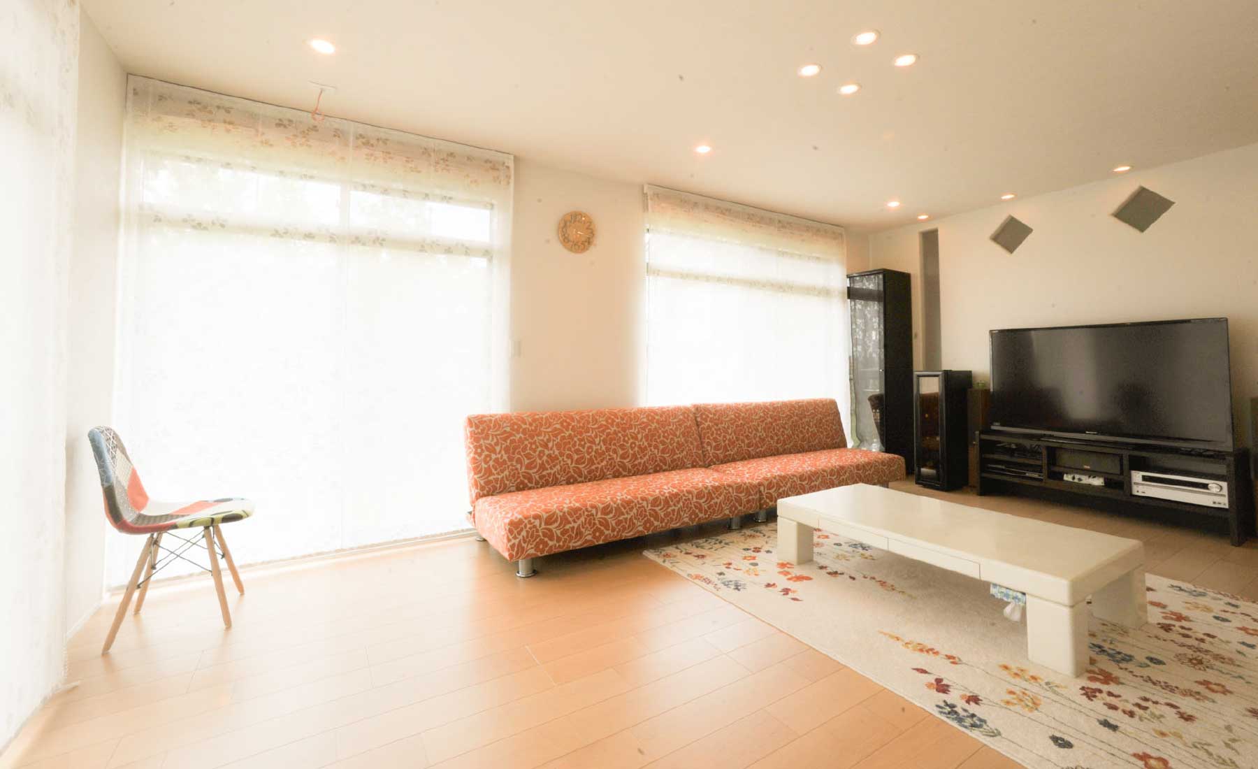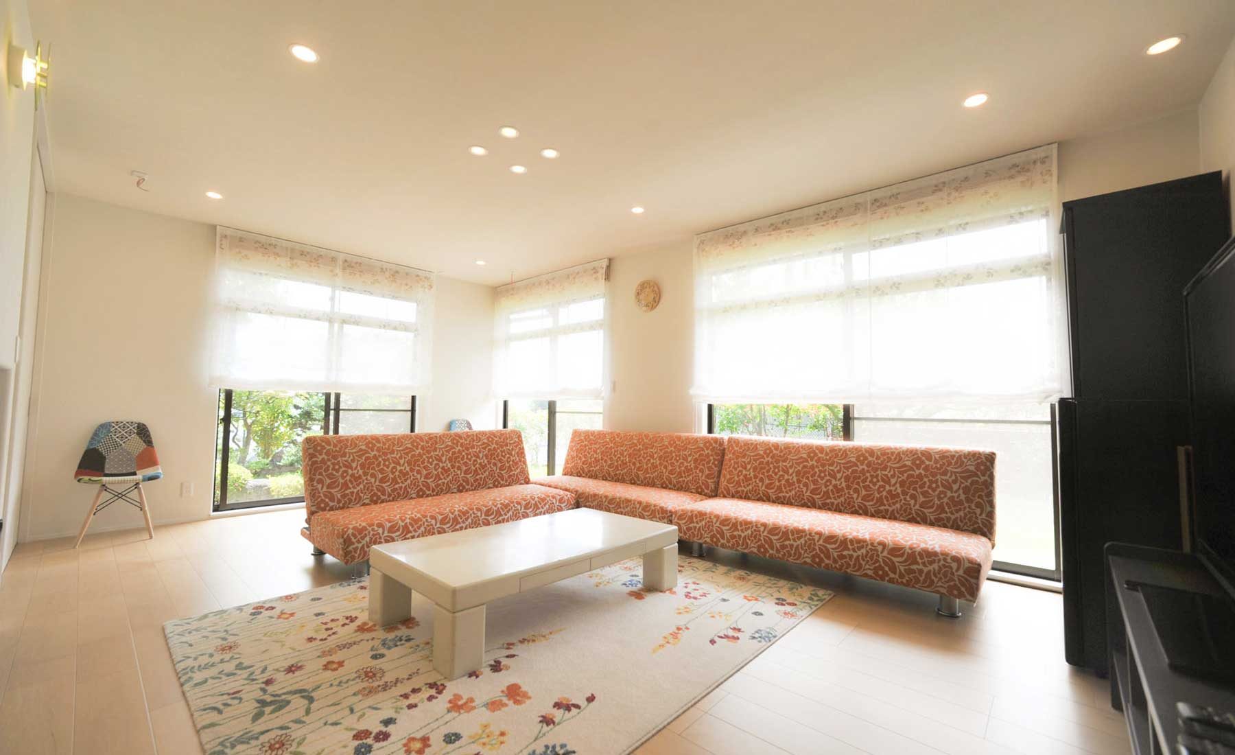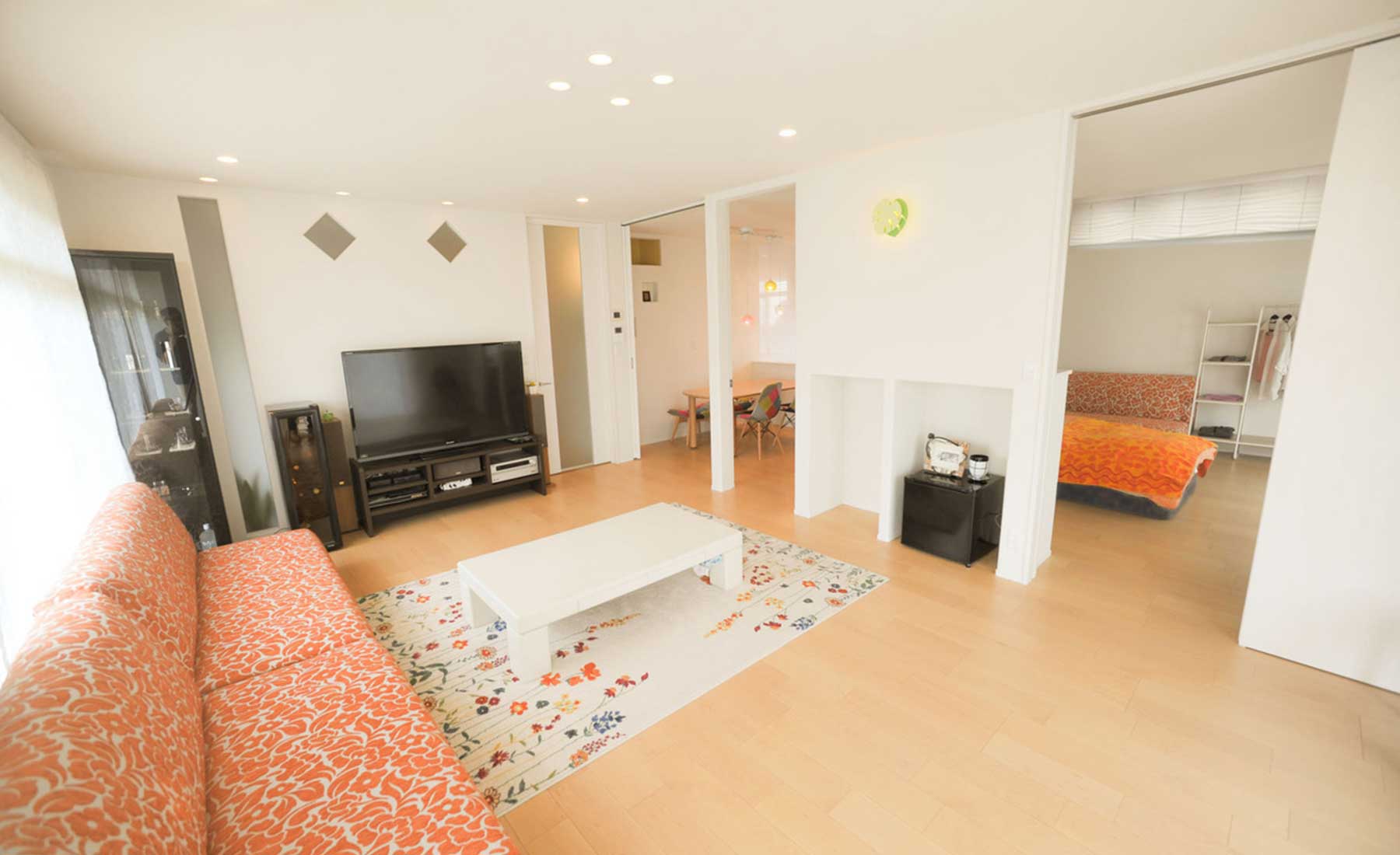 キッチンまで一体感を持たせた贅沢なワンフロア化を実現。普段は適度に仕切れて落ち着いて寛げて、週末はみんなで大盛り上がりの飲み会会場になるリビング。